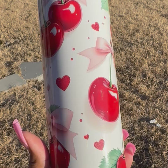 "Indulge in the sweetness of our Cherry So Love 16oz Tumbler Cup! This Valentines inspired cup features charming cherries and bows, making it the perfect custom gift for your loved ones. Sip in style and spread the love with this adorable cup."